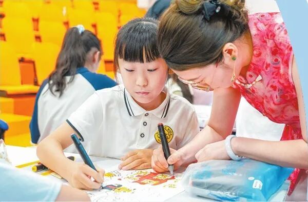 雨后,在中山影视城的罗马剧场内,参加完“预防学生欺凌”“反电信诈骗”的普法打卡后,孩子与家长们在长桌前,以“法小槌”和“小蜜蜂法官”IP创作法治漫画。