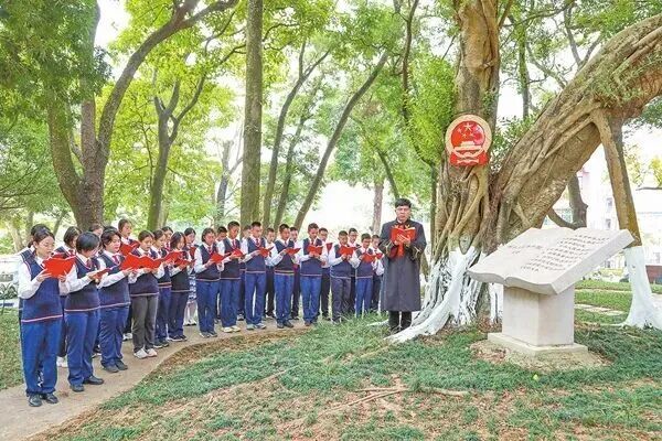 在法院庄严肃穆的审判庭里,同学们“沉浸式”旁听庭审;在火炬开发区红领巾培育基地,同学们自编自导“学生欺凌案”模拟法庭。在中山纪念中学,同学们和法官一同在国徽下诵读宪法。